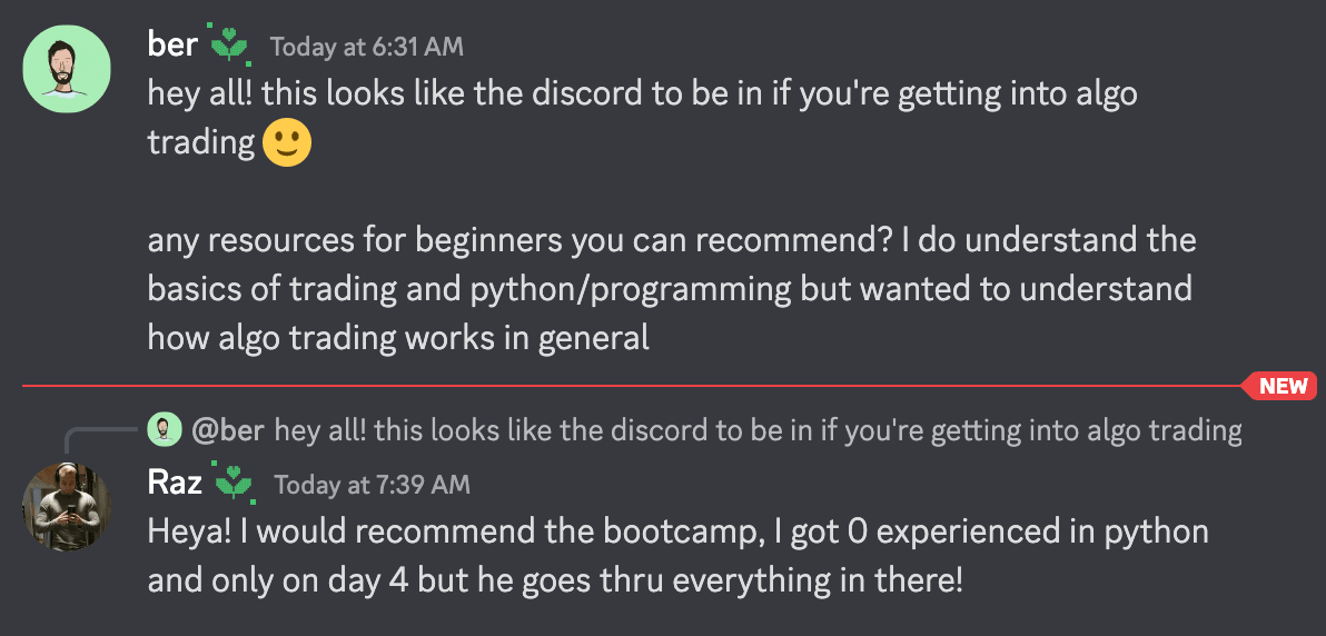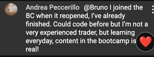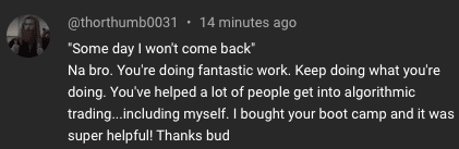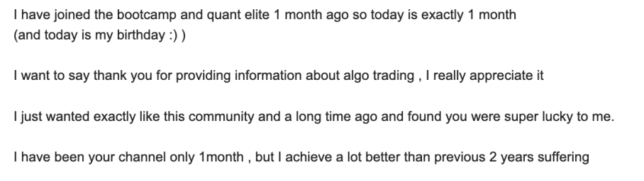 When you join the Bootcamp, you'll learn everything you need about Algo trading. You'll learn exactly what I wish I knew when I started. I would have done anything to have access to this Bootcamp when I was getting started